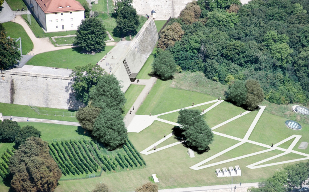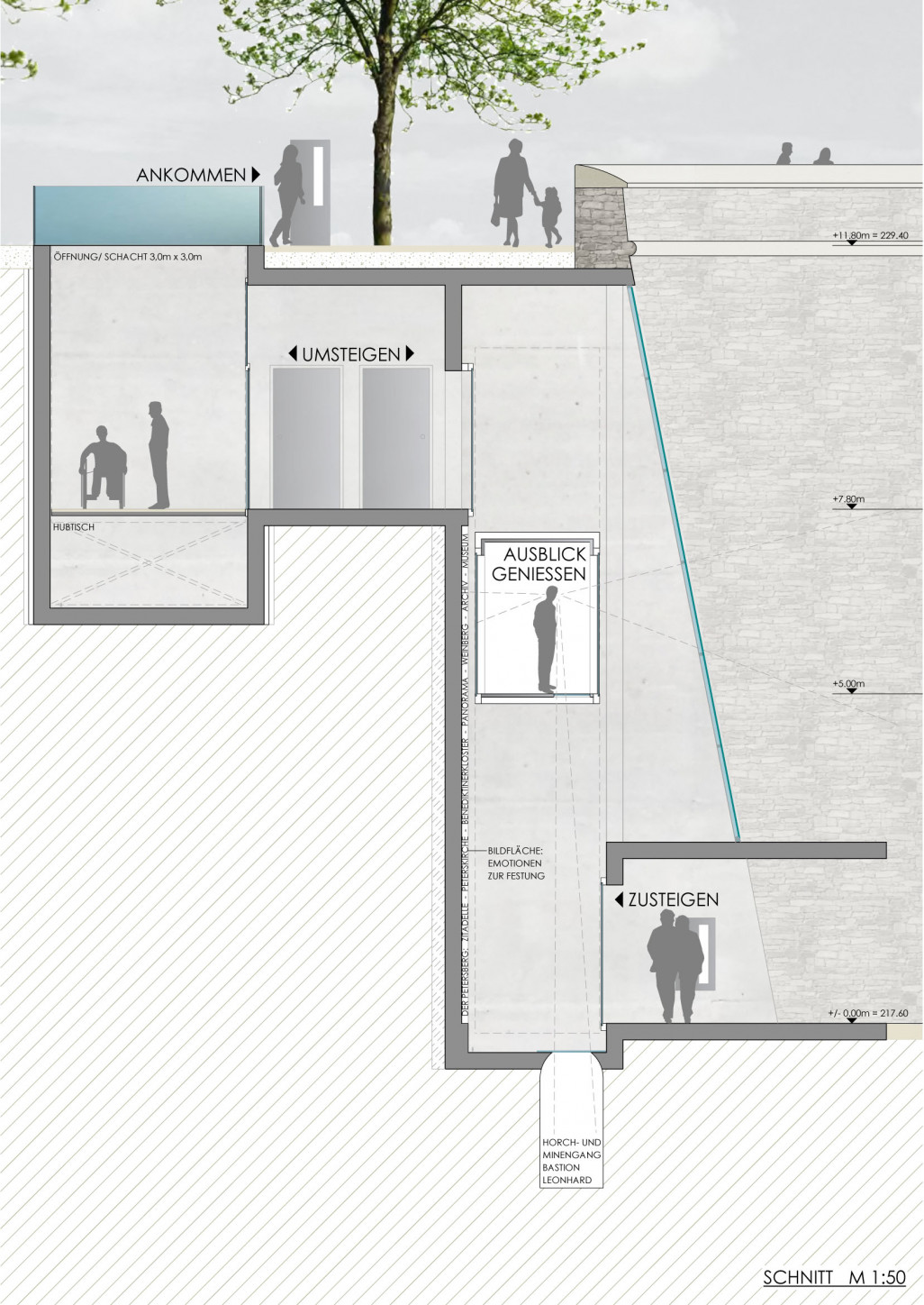 Der Entwurf für den Aufzug auf das obere Festungsplateau auf dem Petersberg rückt Festung und Festungsmauer in den Mittelpunkt der Erfahrung und gibt den Blick frei von der Festungsmauer hinüber zur Stadt. Die Aufzugsanlage selbst nimmt sich bewusst zurück.