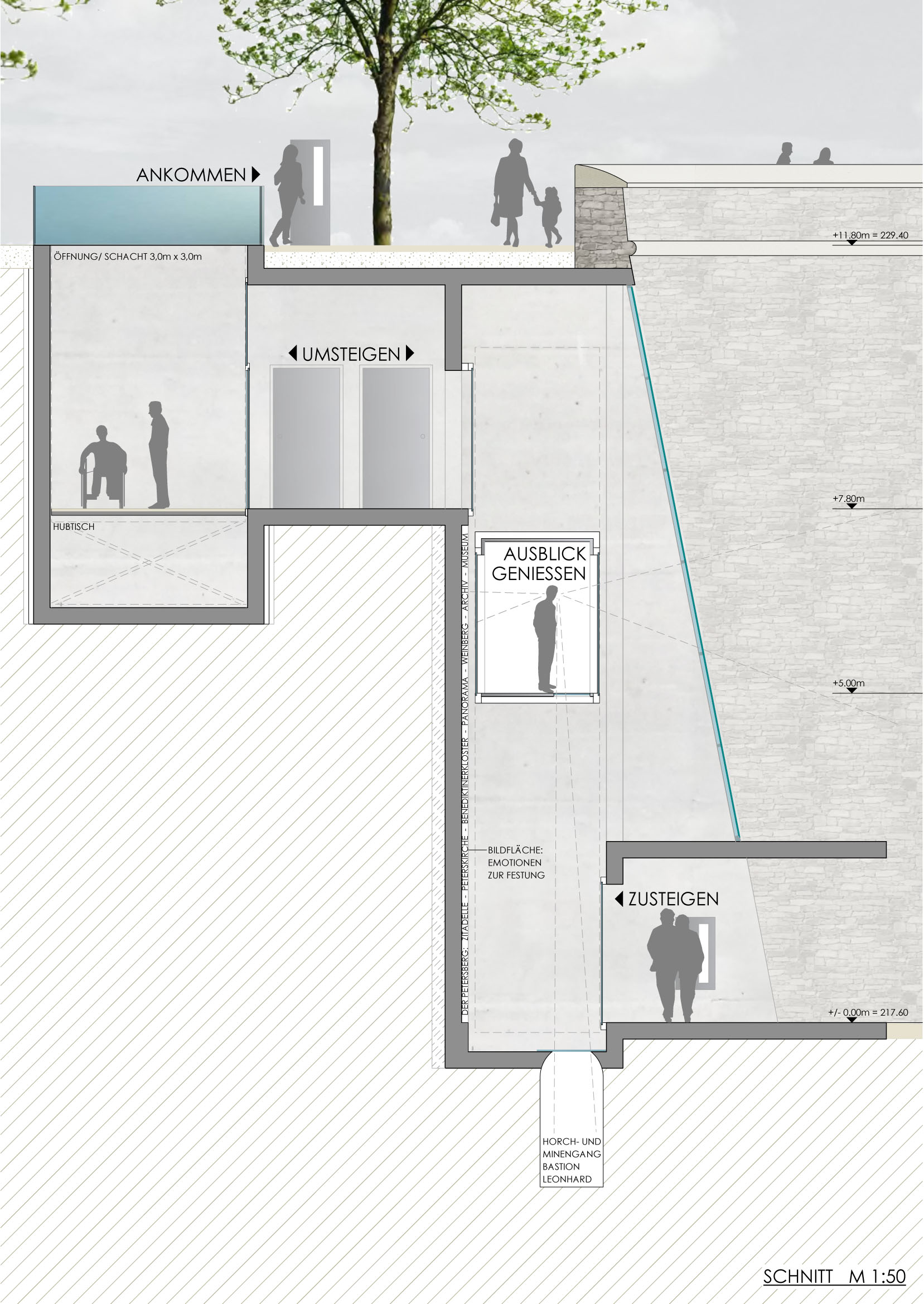 Die passende Begleitmöblierung kann so mit der Ausstattung des Petersberges auf das Zurückhaltendste abgestimmt werden und tritt ebenfalls nicht in den Vordergrund. Im Eingangsbereich ist durch den ca. 3 m tiefen Zugang zum eigentlichen Aufzug der Mauerfuß in keiner Weise beeinträchtigt, lediglich das Vordach weist die Richtung. Alle technischen Nebeneinrichtungen können völlig versteckt im Petersberg untergebracht werden. In Summa ermöglicht der Entwurf zum einen eine außerordentliche zurückhaltende Gestaltung bezüglich der Festungsanlage und schafft gleichzeitig den größten Komfort für die Besucher, sowohl in der Winter- als auch in der Sommerzeit. Ein ganzjähriger Betrieb kann optimal sichergestellt werden.