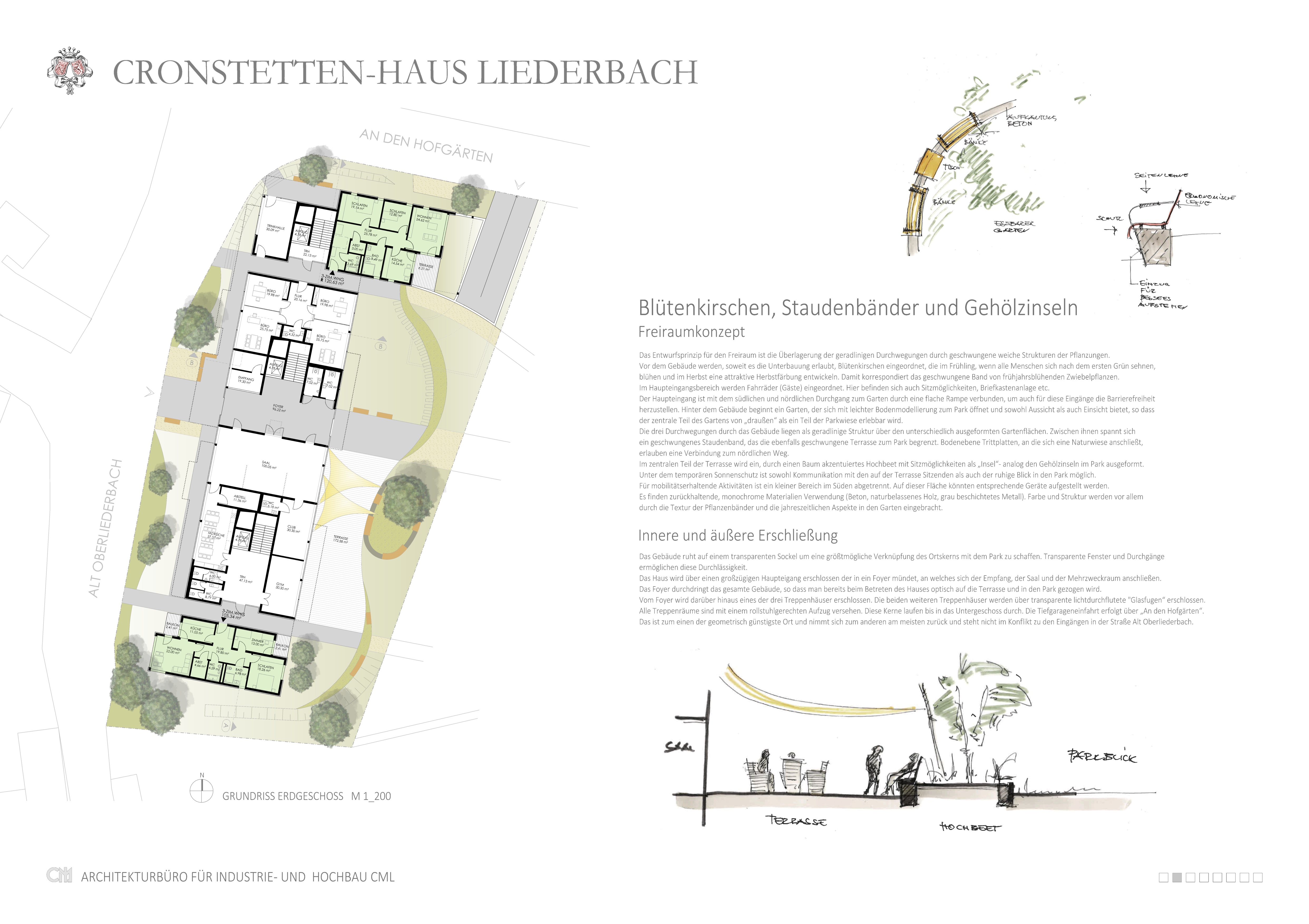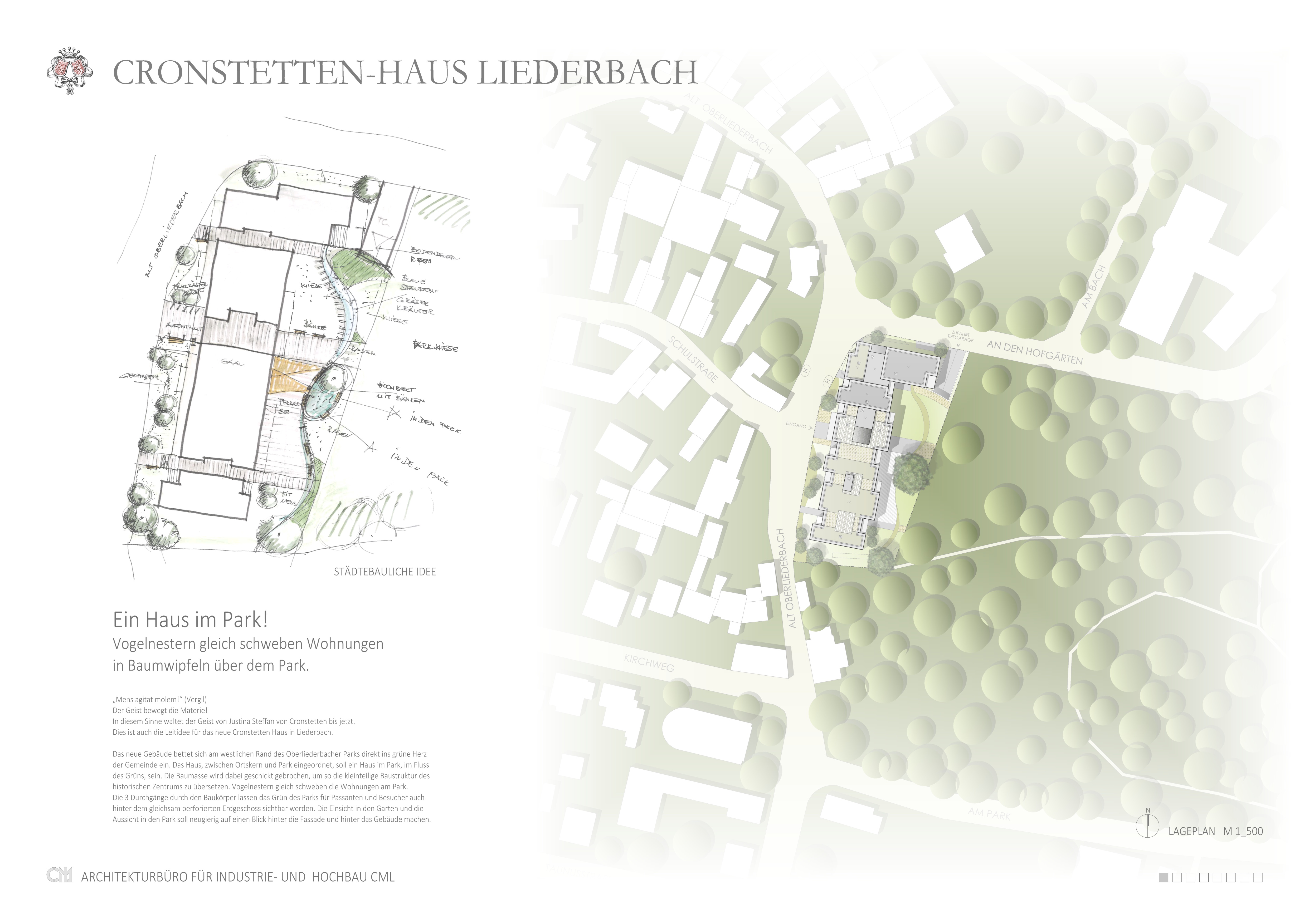 Der Oberliederbacher Park, von keinem geringeren als dem Frankfurter Landschaftsgärtner Franz Heinrich Siesmayer, dem Schöpfer zahlreicher Gärten u.a. dem Palmengarten in Frankfurt, geplant und umgesetzt, zeichnet sich durch alten Baumbestand und sensible Bodenmodellierung aus. Nach der Mitte des 19. Jahrhunderts entstanden, ist er ein typisches Beispiel für die Landschaftsparks dieser Epoche. Das neue Gebäude liegt direkt am Rand des Oberliederbacher Parks.