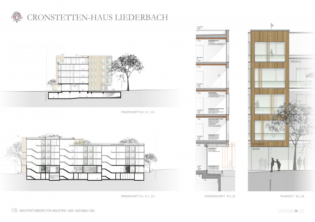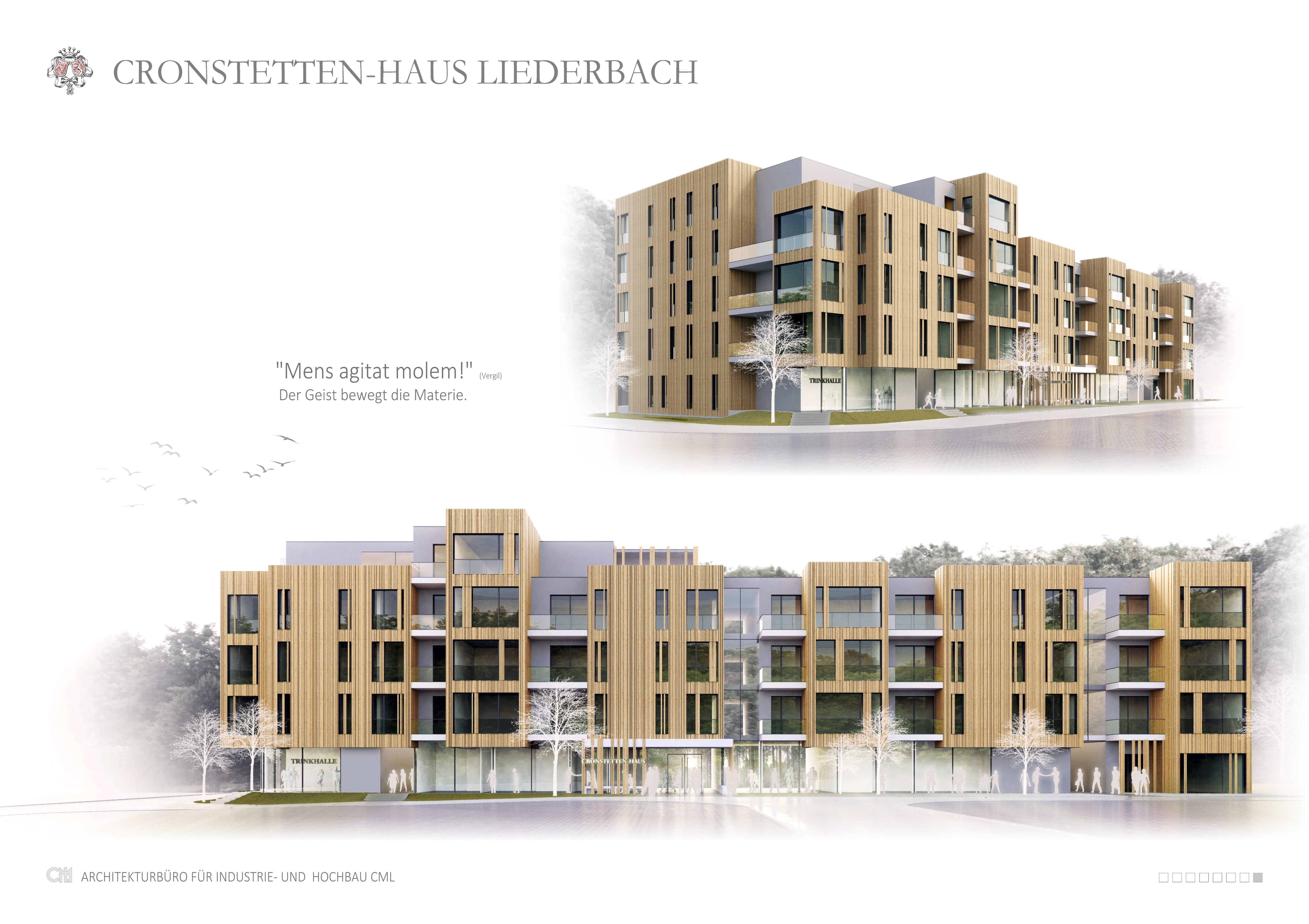 Das Gebäude ruht auf einem transparenten Sockel, um eine größtmögliche Verknüpfung des Ortskerns mit dem Park zu schaffen. Transparente Fenster und Durchgänge ermöglichen diese Durchlässigkeit. Die Materie der drei Vollgeschosse erhebt sich fast spielerisch leicht in die Höhe und wird ebenfalls über alle Geschosse von gläsernen Fugen gebrochen. Die oberen Geschosse "schweben" somit scheinbar über dem gläsernen Erdgeschoss. Diese Leichtigkeit wird durch die Materialität noch verstärkt. Das Erdgeschoss ist in einer Stützenkonstruktion aufgelöst und eine transparente Pfosten-Riegel-Fassade lässt den Park durch das Haus strömen. Die Obergeschosse werden sowohl konstruktiv als auch als Fassadenbekleidung in Holz ausgeführt. Für die Bekleidung sind strukturierte Vollholzprofile vorgesehen, die den Baukörper lebendig wirken lassen.