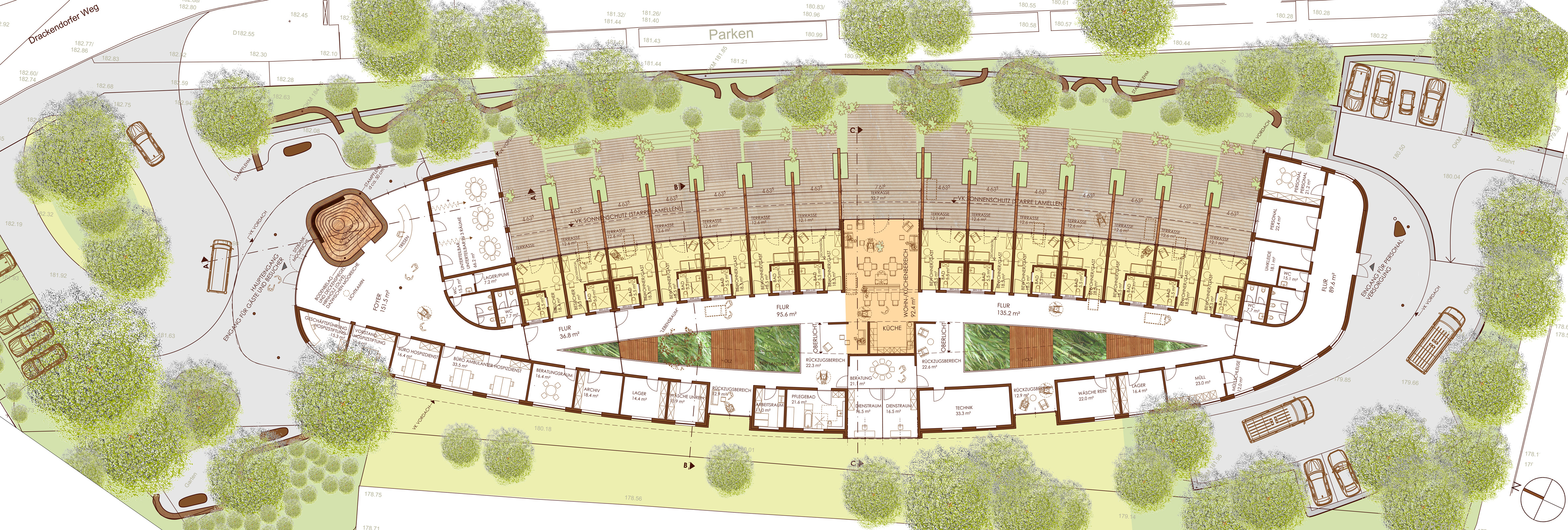 Der Freiraum zeichnet sich hier durch wenige, aber kraftvolle gestalterische Elemente aus und wird durch Großbäume und gebogene Lehmmauern gegliedert, ähnlich der baulichen Aufteilung in große und offene Bereiche für die gemeinschaftliche Nutzung, aber auch in kleine und intime Bereiche, die individuell jedem Bewohnerzimmer zugeordnet sind.