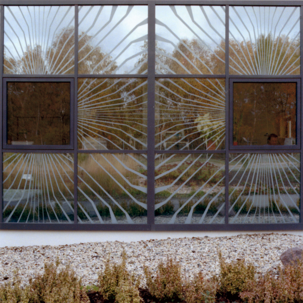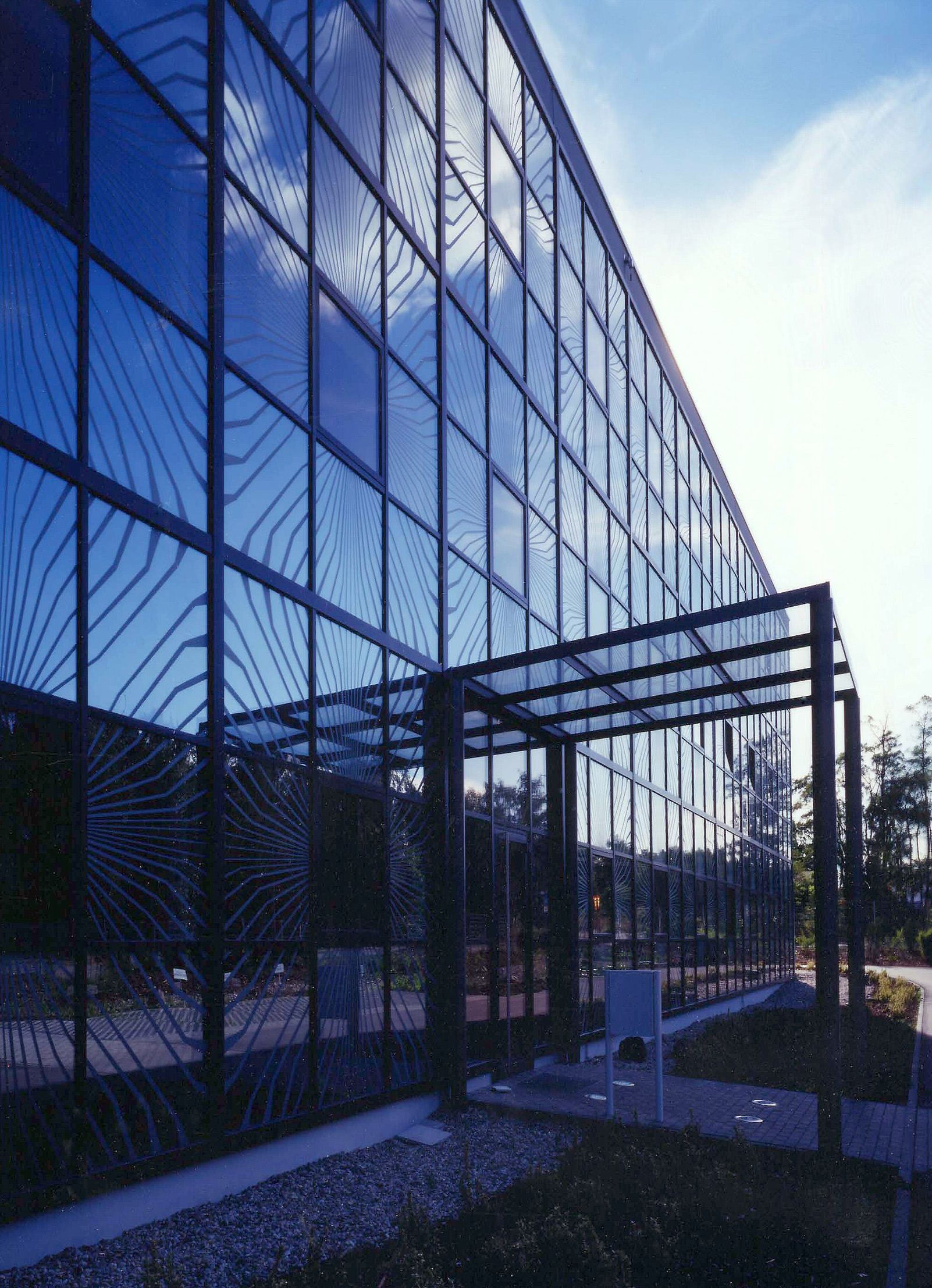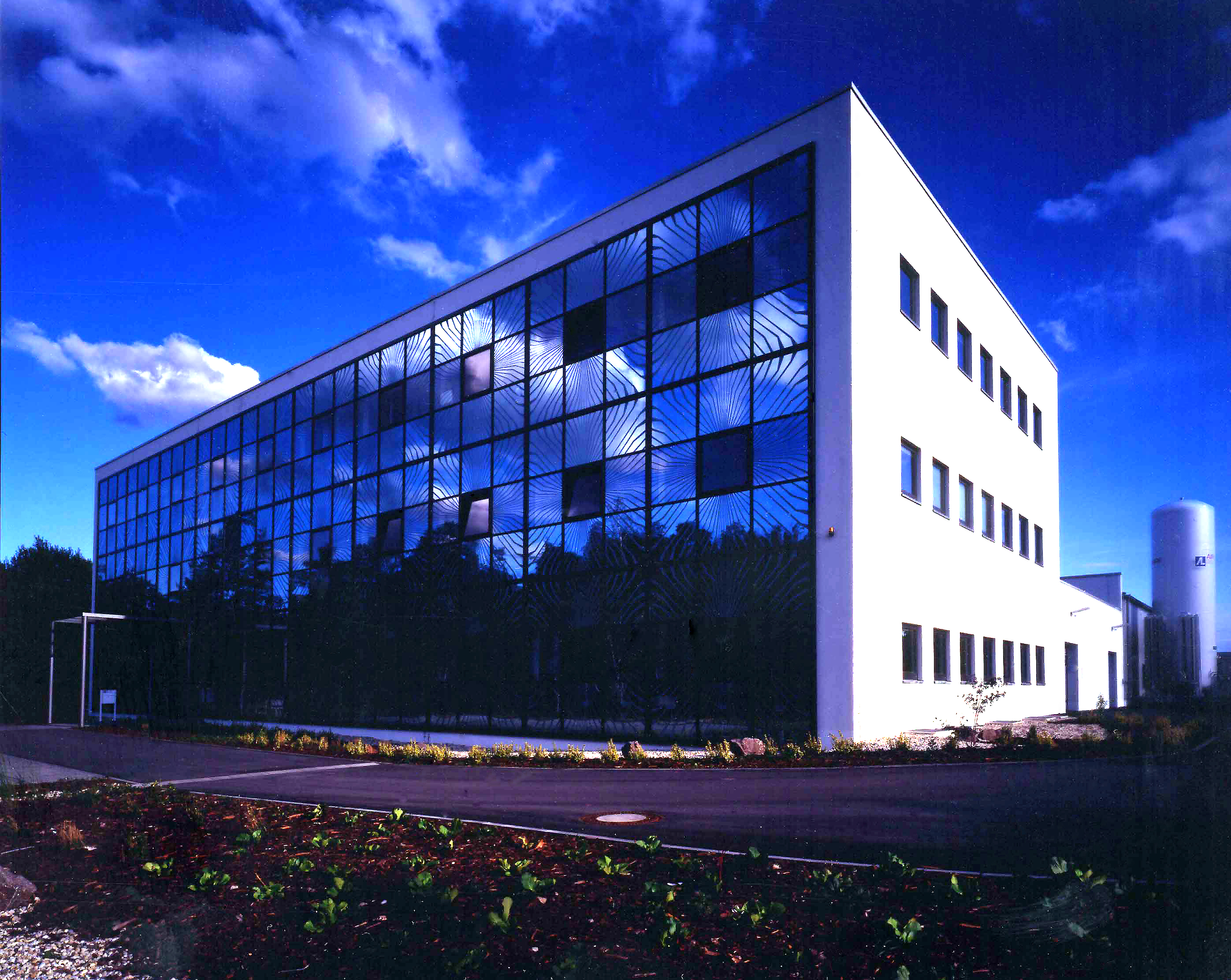 Entwurfsziel war es, eine Fassade zu entwickeln, die die serielle Fertigung dieser technischen Bauteile wiederspiegelt. Die Umsetzung erfolgte dahingehend, dass 9 Fassadenelemente zu einem "elektronischen Bauelement" zusammengefasst wurden und dieses Bild grafisch darstellt. Dabei sind die äußeren 8 Felder verspiegelt ausgebildet und eine entsprechende Struktur wurde in das Spiegelglas eingeätzt. Das zentrale Feld ist bewusst nicht verspiegelt, so dass es bei Tageslicht als ein schwarzes Quadrat in Erscheinung tritt. Die optische Wirkung entspricht so einem überdimensionalen Chip auf einer Leiterplatte.