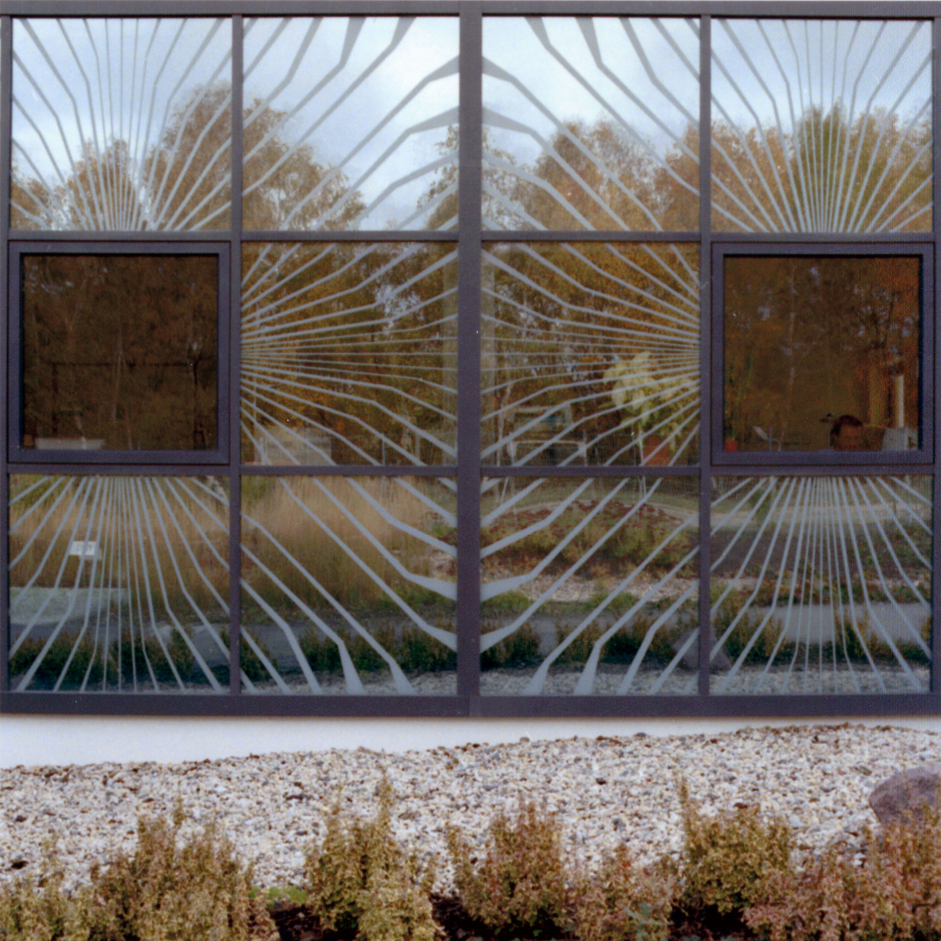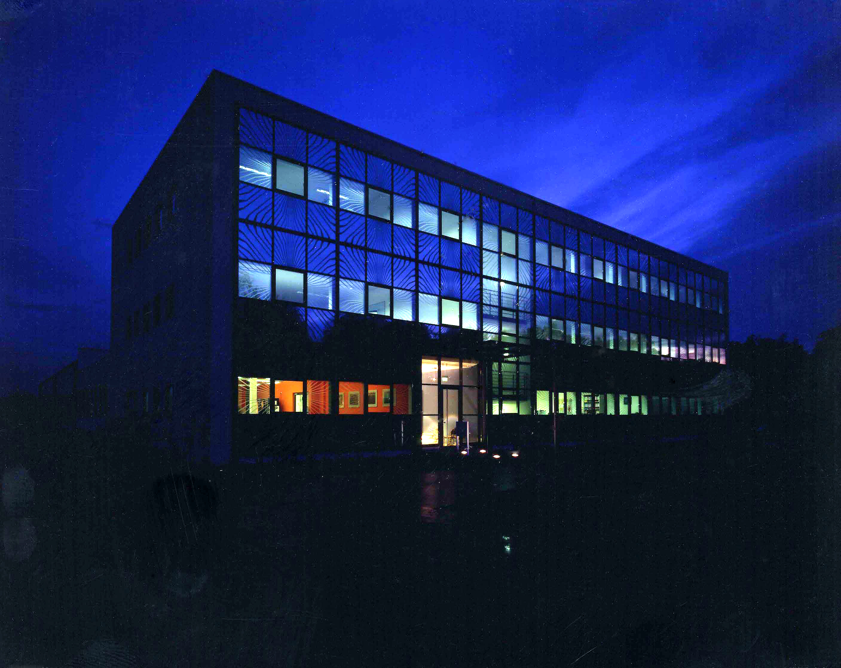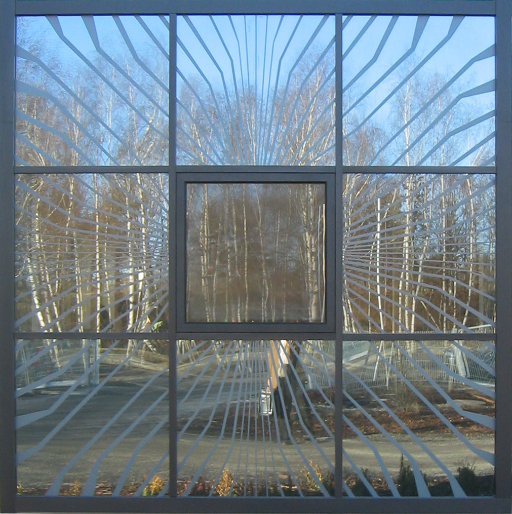 Entwurfsziel war es, eine Fassade zu entwickeln, die die serielle Fertigung dieser technischen Bauteile wiederspiegelt. Die Umsetzung erfolgte dahingehend, dass 9 Fassadenelemente zu einem "elektronischen Bauelement" zusammengefasst wurden und dieses Bild grafisch darstellt. Dabei sind die äußeren 8 Felder verspiegelt ausgebildet und eine entsprechende Struktur wurde in das Spiegelglas eingeätzt. Das zentrale Feld ist bewusst nicht verspiegelt, so dass es bei Tageslicht als ein schwarzes Quadrat in Erscheinung tritt. Die optische Wirkung entspricht so einem überdimensionalen Chip auf einer Leiterplatte.