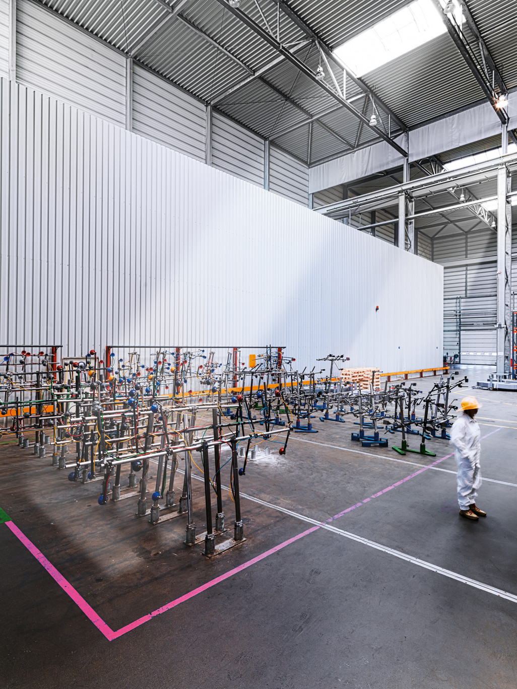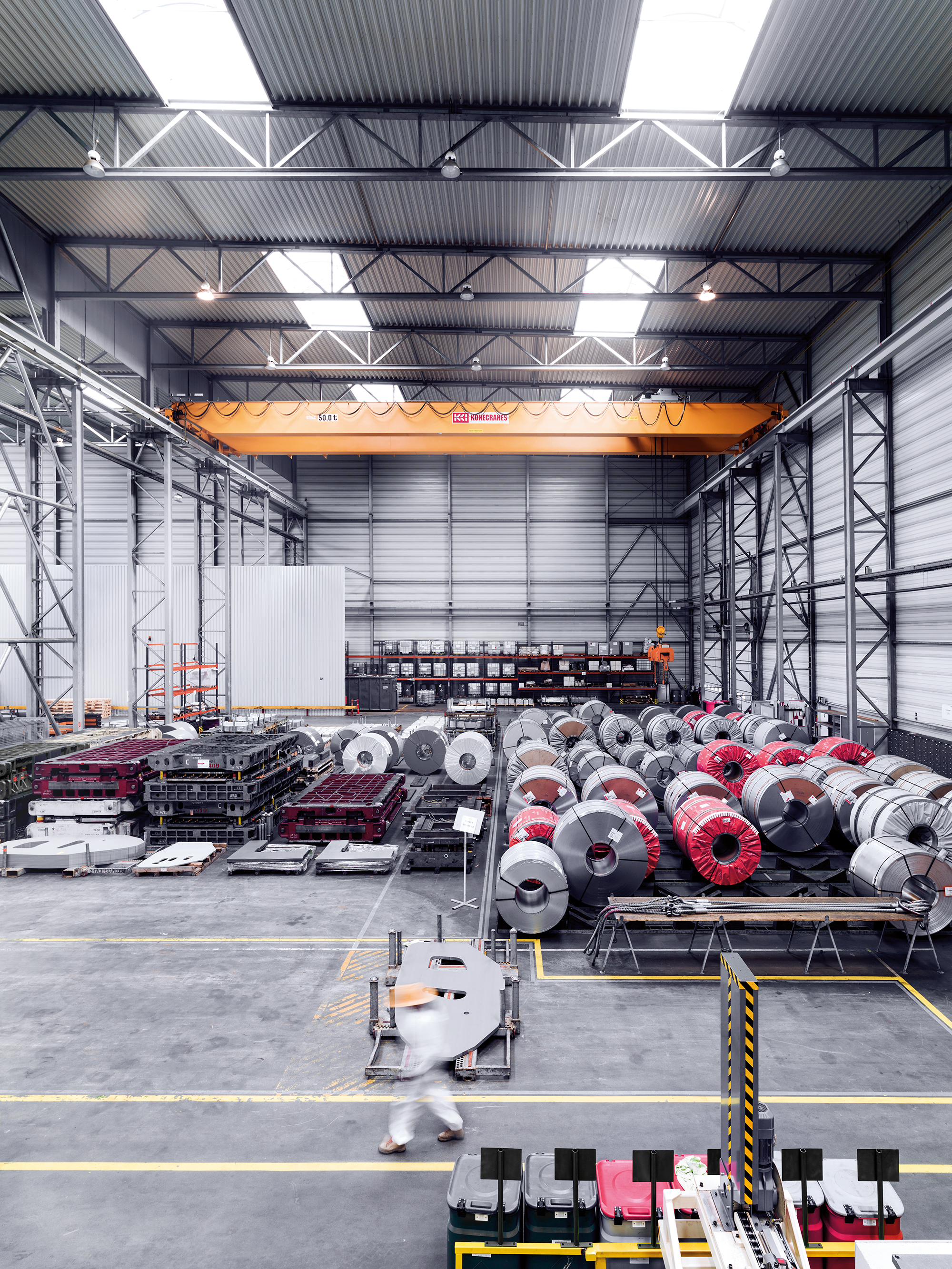 Die TWB GmbH & Co. KG stellt als Zulieferer für die Automobilindustrie Karosserieteile her. Neben den erheblichen Anforderungen an die Ebenheitstoleranzen sind durch das Gebäude sehr große Lasten abzuführen. So laufen in den Hallenschiffen jeweils bis zu zwei 50-Tonnen-Kräne.