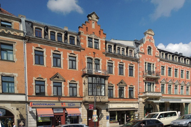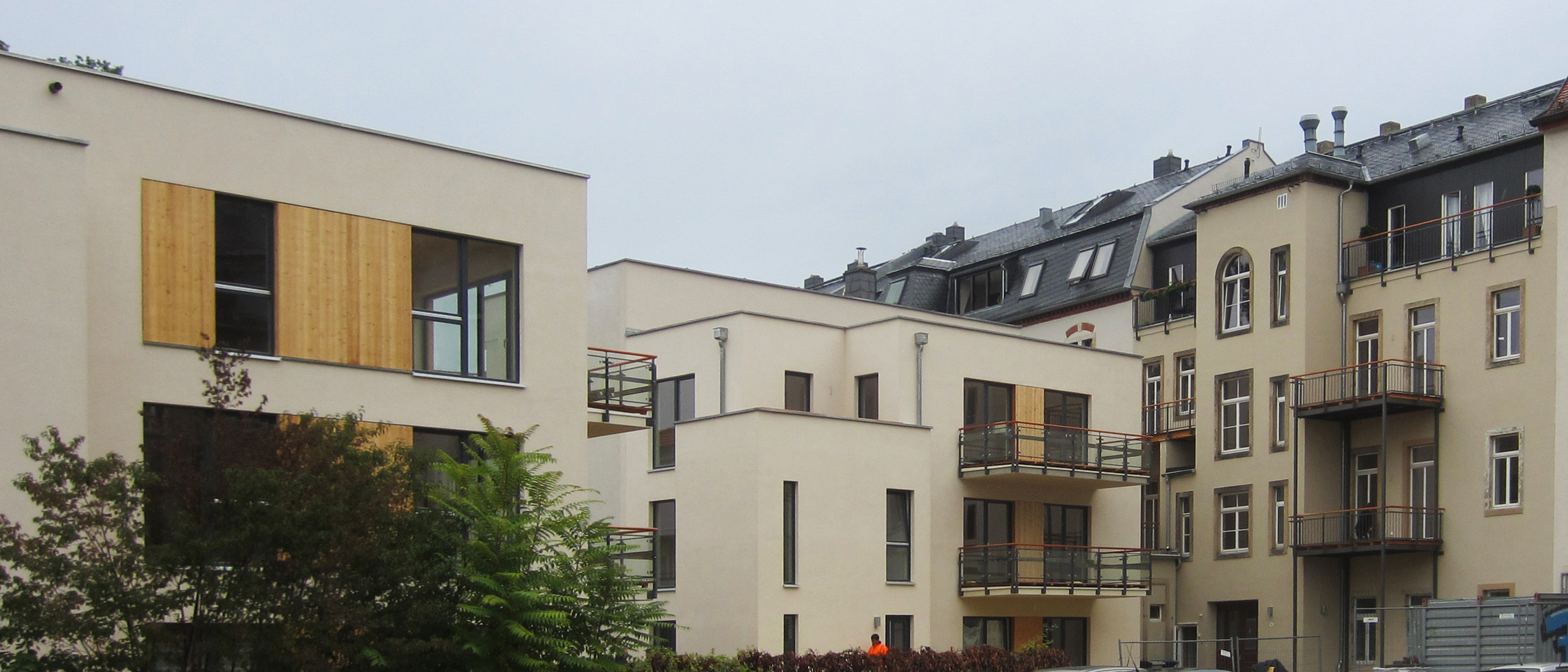 Die gründerzeitliche Bebauung am Schillerplatz in Dresden wurde um 1890 errichtet. Gelegen in der Nähe der Loschwitzer Brücke, auch "Blaues Wunder" genannt, erforderten die Sanierung des bestehenden Wohn- und Geschäftshauses und der gleichzeitige Neubau im Hofbereich aufgrund der räumlichen Enge im Stadtgefüge eine gute Organisation der Baustelle. Das bestehende Wohngebäude mit zwei Ladeneinheiten im Erdgeschoss wurde in der Vergangenheit für die Nutzung als Bürohaus umgebaut.